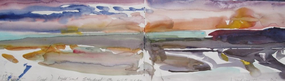 Sitting quietly in the same place I see many birds and animals, the peregrine falcon holds a particular allure for me and I often see and hear military activity, the manoeuvres of planes and helicopters bombing and shelling the target area at Cefn Sidan. Witnessing this I sense the beauty of nature, land and sea compromised by these violent, aggressive intrusions, momentarily the Earth loses its virtue to man’s madness but nature and the sun redeem and these watercolours of the sunset are my way of holding on to the beauty of the Earth and to the wonder of life itself.